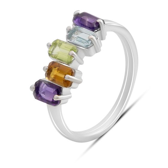 Кольцо 925 пробы с натуральным аметистом 1.55ct, цитрином, хризолітом, топазом. Вес украшения 2,55г. Физический размер изделия (высота*ширина): 5х15мм. Страна происхождения: Индия.