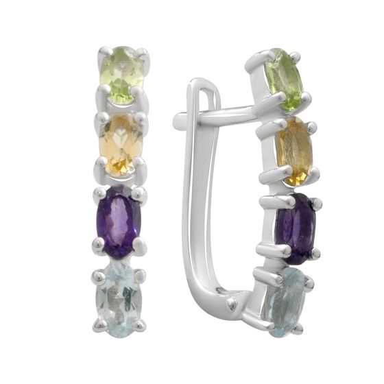 Серьги 925 пробы с натуральным аметистом, топазом, цитрином, хризолітом. Вес украшения 3,63г. Физический размер изделия (высота*ширина): 3х20мм. Страна происхождения: Индия.