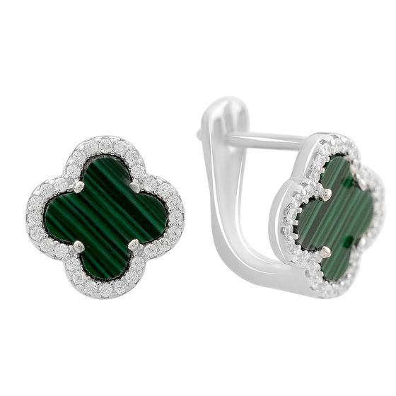 Серьги 925 пробы с малахитом, фианитами. Вес украшения 3,46г. Физический размер изделия (высота*ширина): 10x10мм. Страна происхождения: Индия.